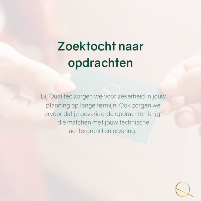 Solliciteer vandaag nog bij Qualitec als onderaannemer voor zowel korte als langdurige projecten. We zorgen voor zekerheid in jouw planning op lange termijn en zorgen ervoor dat je gevarieerde opdrachten krijgt die matchen met jouw technische achtergrond en ervaring.